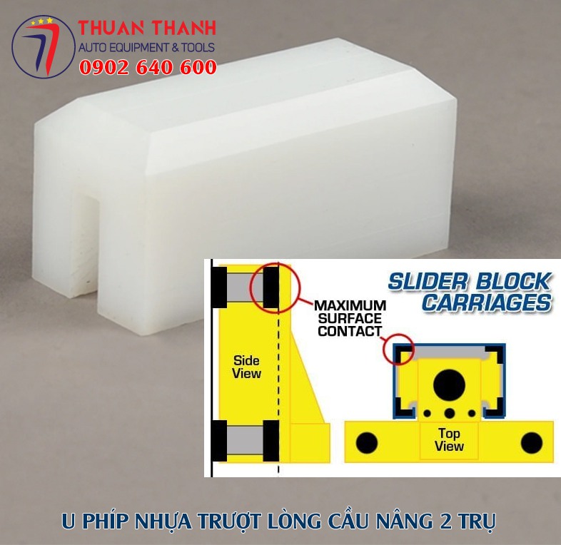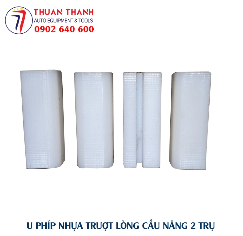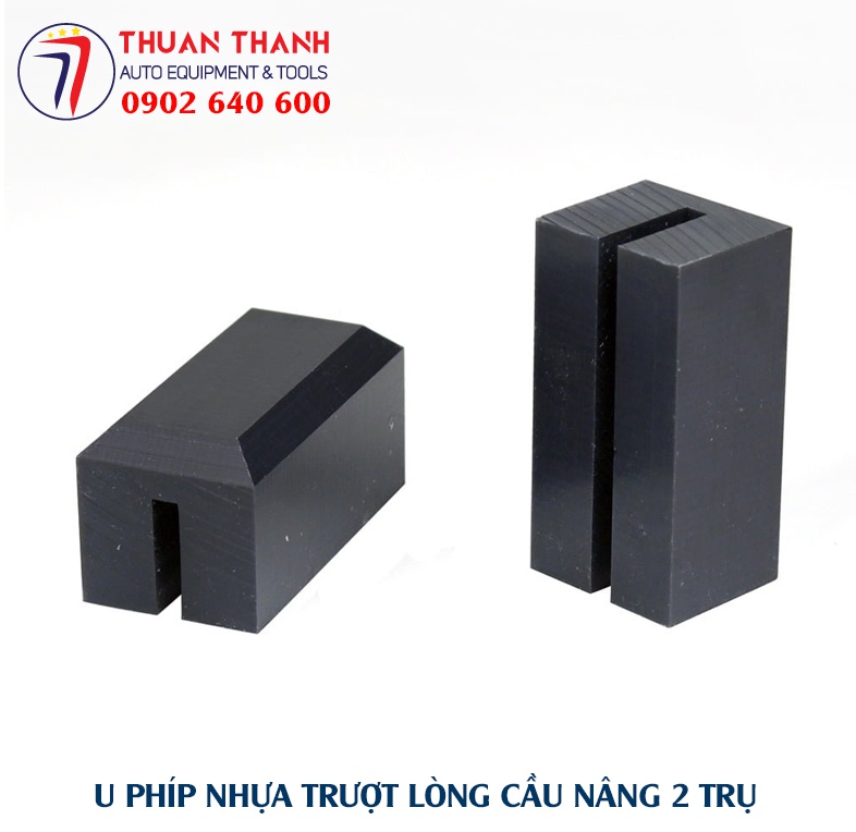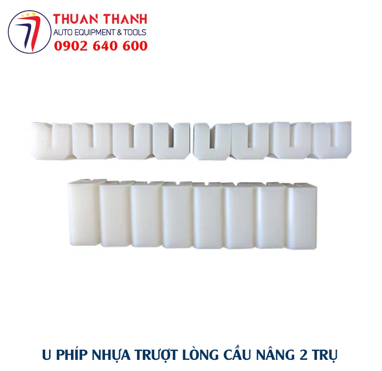 Bộ thiết bị cầu nâng ô tô 2 trụ cần phải sử dụng 16 cục U phíp nhựa cứng có tính trượt cao trong điều kiện làm việc để không gây mài mòn phần thép giữa bệ đỡ tì tay cầu nâng với thành lòng cầu nâng