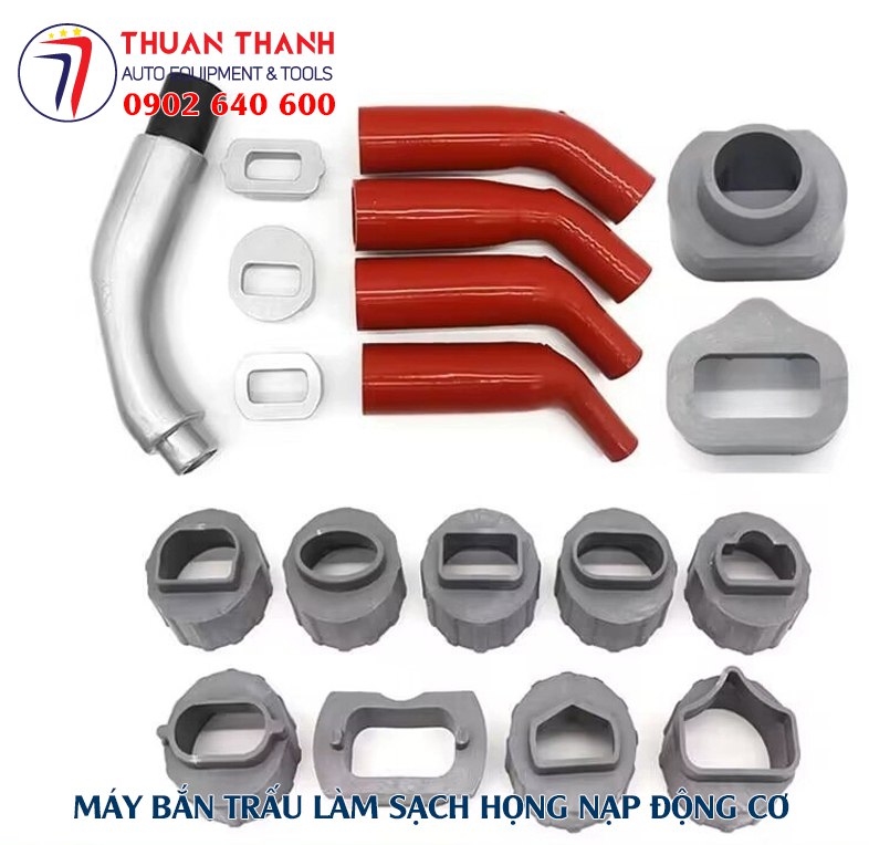 Một bộ máy bắn trấu vệ sinh họng nạp hoàn chỉnh bao gồm máy hút, súng phun, bộ béc cổ họng hút với đa dạng kích thước phù hợp với các loại xe khác nhau.